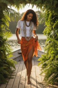 Ook zijn heel veel producten duurzaam en gemaakt van hergebruikt textiel. Het model heeft een oranje sjaal om van hergebruikte sari's uit Nepal en is al helemaal voorbereid op de zomer, want orange is the new black!
